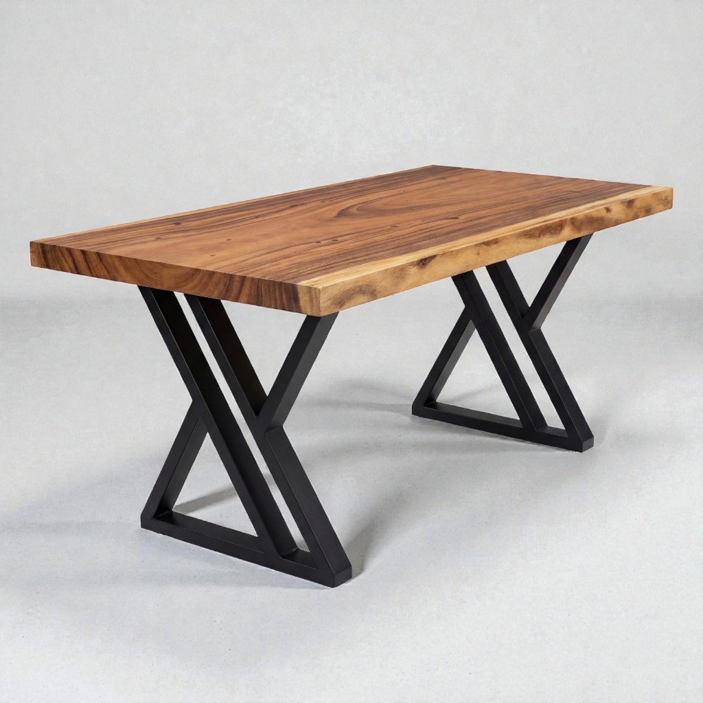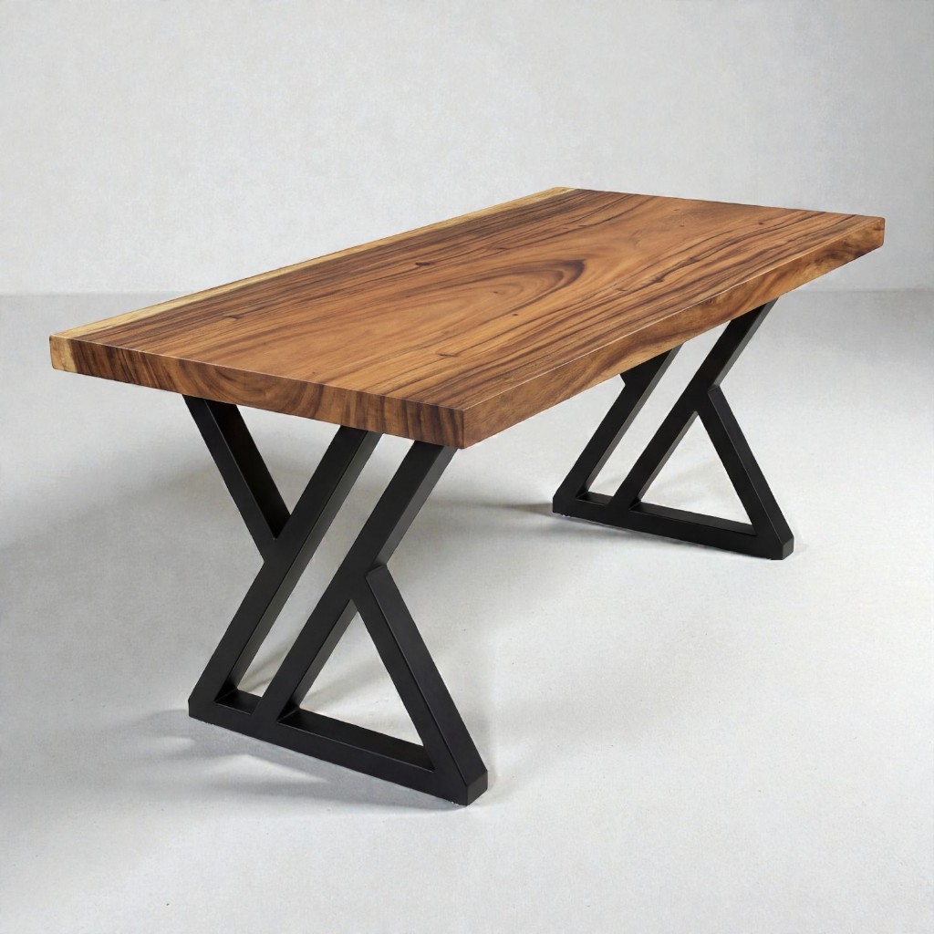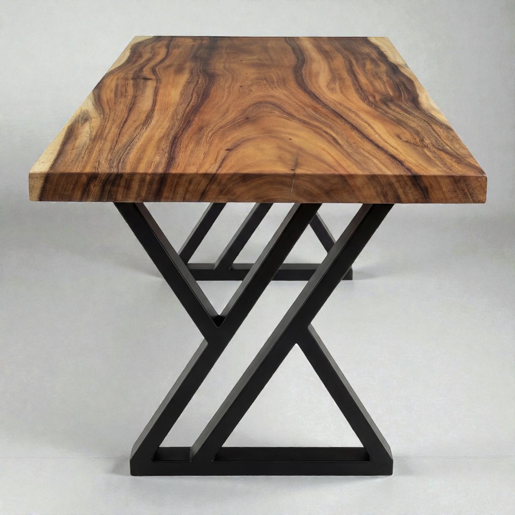 โต๊ะไม้จามจุรีแผ่นเดียว (ท็อปไม้ขอบตรง) ขาเหล็กพ่นดำ ทรง Double Z สไตล์โมเดิร์น / สไตล์ลอฟท์ จัดส่งฟรี!